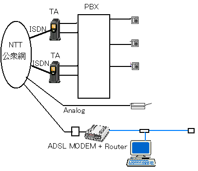 ISDN回線が2回線、TAを経由しアナログ換算で4回線として構内交換機PBXに収容されている。