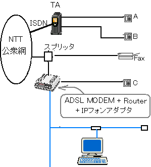 NTTの公衆回線がINS64(ISDN)とアナログ回線それぞれ1本づつ引いてあり、アナログ回線を利用してADSLを使用しているケースを想定する。当初はアナログ公衆回線を2本引いていたがISDNブーム時に2本ともISDNへ同番移行し、最近になってADSLブームでISDNのうち一本を電話番号が変わってしまうがアナログに戻しADSLにも利用しているケースとする。