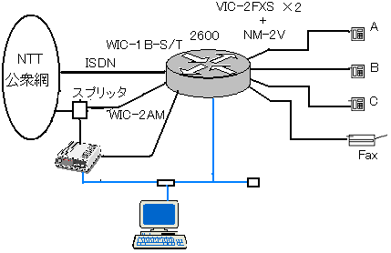 見かけではCisco 2600が1台だが外線と内線間はPC LANであり、2600の中ではVoIPで音声が流れている。