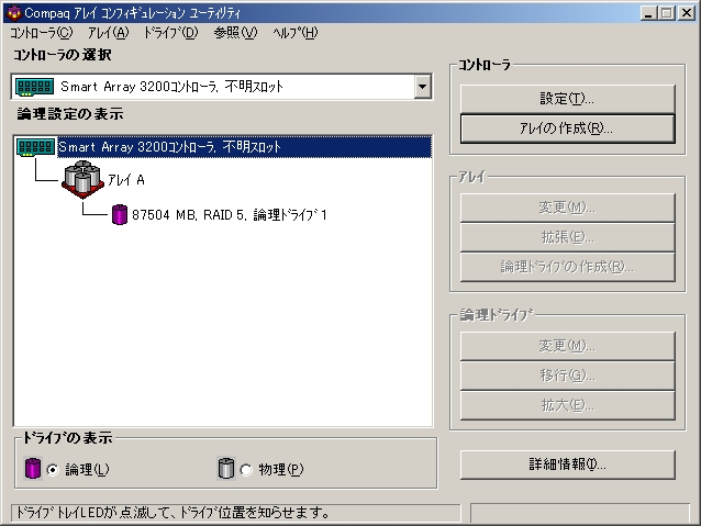 ハードウェアRAIDで構成した複数の物理ドライブからなる1台の論理ドライブは、OSからは1台の物理ドライブとして見えます。 Arrayコントローラーでフォルトトレランスを有効と設定しても、OSのディスク管理ツールではフォルトトレランスが無効と認識されていますが、システムとしてはフォルトトレランスは有効です。