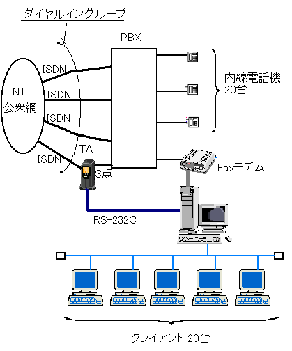 Fax送信は各クライアントでプリンタ印刷のごとく送信すると、Windows 2000 Serverに接続してあるFax