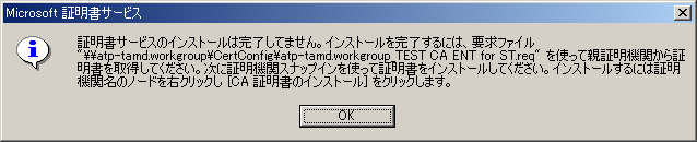 15. [Microsoft証明書サービス]メッセージはファイルパスをメモし[OK]をクリックします。