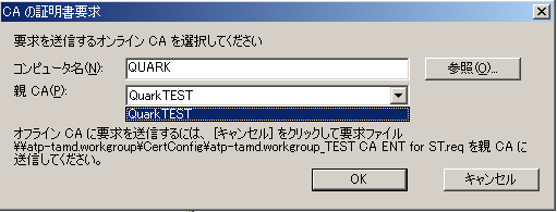 5. [CAの証明書要求]ダイアログの[親CA]をプルダウンすると親CA名が入ります。[OK]をクリックします。