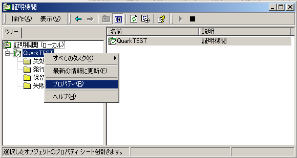2. 親CA名を右クリックし[プロパティ]をクリックします。