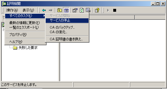 6. [操作]メニュー−[すべてのタスク]から[サービスの停止]をクリックし、サービスが停止したあと、同様の手順でサービスを開始します。