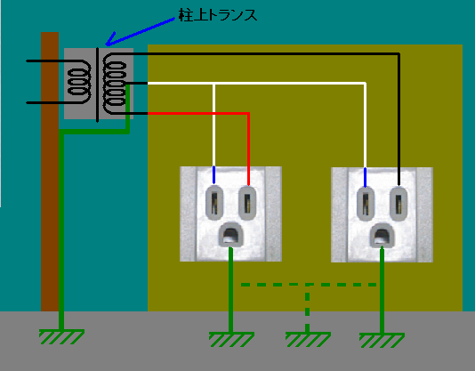 アースは接地されているし、ニュートラルも柱上トランスの中点タップで接地されていることから、ニュートラル―アース間は0Vである。