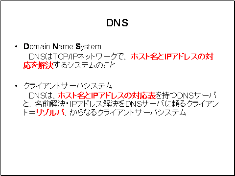TCP/IPネットワークで、 ホスト名とIPアドレスの対応を解決する場合に DNSは必要なシステムとなっています。