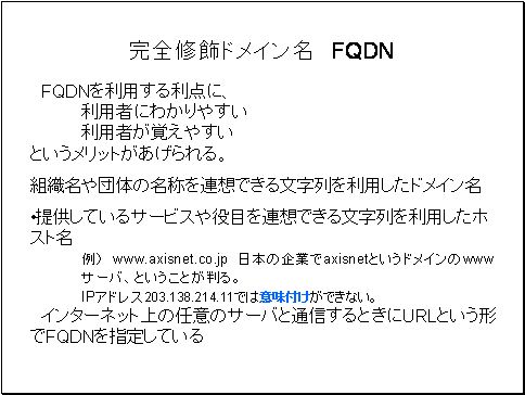 先ほど説明したようにホスト名+ドメイン名からなる文字列をFQDNと呼びます。FQDNを利用する利点に、