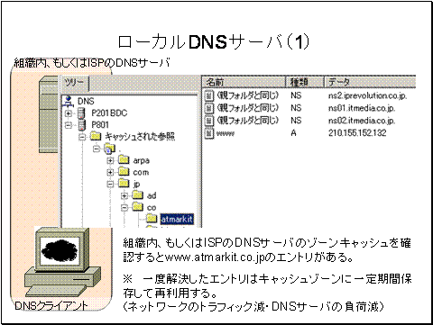 ユーザーが操作しているPCwww.atmarkit.co.jpというホストのIPアドレスを、ユーザ組織内のDNSサーバ、もしくは加入しているISPDNSサーバに問い合わせます。
