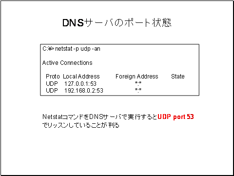DNSサーバ上でnetstatコマンドを実行するとUDPポート53番でリッスン(待ち受け)している様子がわかります。