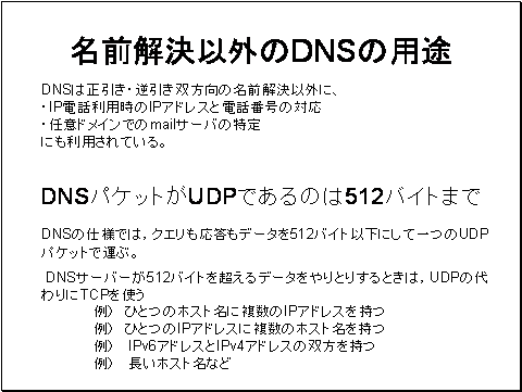 に、DNSサーバーが512バイトを超えるデータをやりとりすることがあります。このようなときは,UDPの代わりにTCPを使い512バイトを超えるデータを扱います。