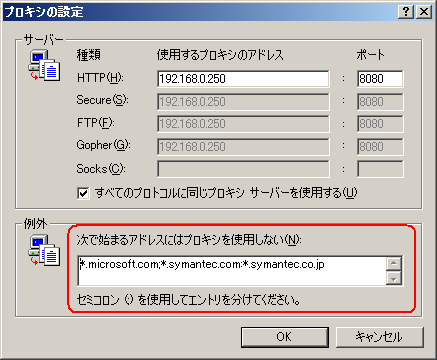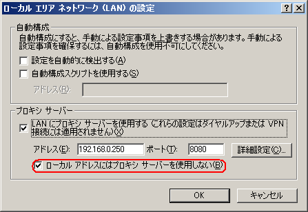 で、このM田さんに、「URLフィルタ間違ってかかっているみたいで、まったくインターネットが見えません。それどころか192.168.0.55というプライベートアドレスも見えない。いつもは、ローカルアドレスではプロキシを使用しないにチェックを入れるだけで十分なのだが、今回は次のアドレスにはプロキシを使用しないにも入れないと見えない。」と申し述べた。