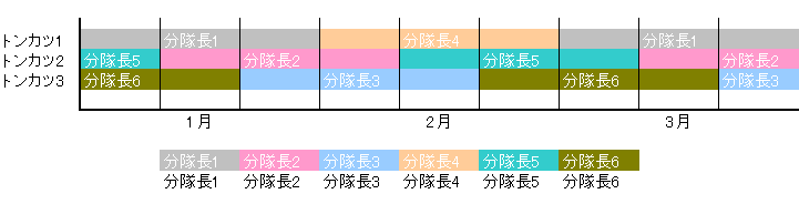 ※ 分隊として職務遂行能力が高く、参謀本部提示のスケジュールに追いついてしまっている場合にも、その日にこなす予定をその日に考えるというケースもある。しかし、当該ケースは2〜3ヶ月の長期の予定でミッションを遂行するケース。