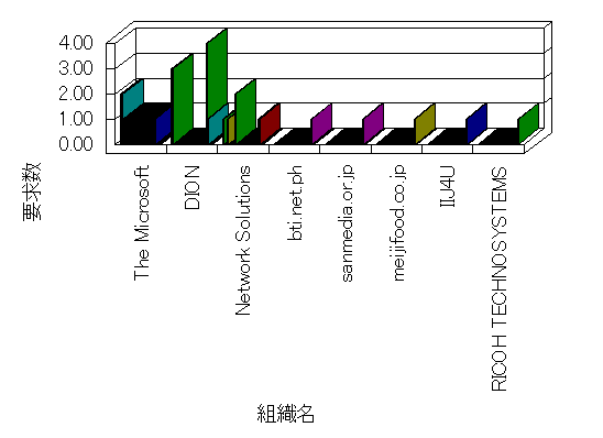 組織ユーザーにインターネット接続を提供する、商用または非営利団体、学術・行政機関などの、インターネット ドメイン で識別される団体や組織です。Microsoft Site Server Analysis は同じ組織に登録されたすべてのドメインを 1 つの組織としてグループ化します。ドメインがデータベースで使用できない場合は、1 つのインターネット ドメインが 1 つの組織を識別するのに使用されます。
